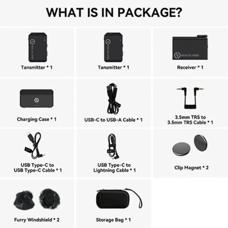 پک شامل: دو میکروفون یقهای، دو فرستنده، یک گیرنده، کابل و لوازم جانبی